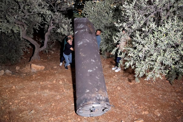 Palestinians investigate a projectile, after Iran fired a salvo of ballistic missiles, in Tubas, in the Israeli-occupied West Bank, Oct. 1, 2024.Raneen Sawafta/Reuters
