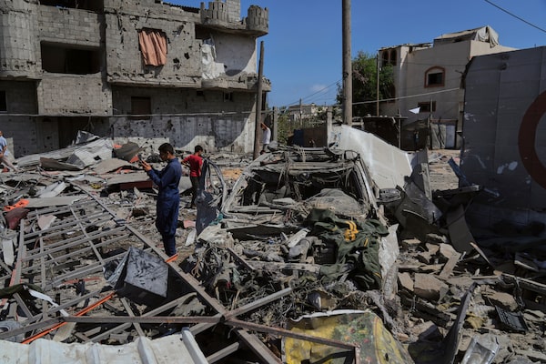 Palestinians inspect the wreckage of a gas station destroyed in an Israeli airstrike in Deir al-Balah in central Gaza.Abdel Kareem Hana/The Associated Press