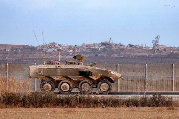 An Israeli army armoured personnel carrier moves along the border fence with the Gaza Strip in southern Israel.JACK GUEZ/AFP/Getty Images