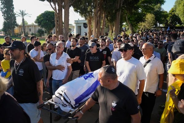 Relatives and friends attend the funeral of slain hostage Almog Sarusi, who was killed in Hamas captivity in the Gaza Strip, at a cemetery in Ra'anana, Israel, on Sept. 1.Ariel Schalit/The Associated Press