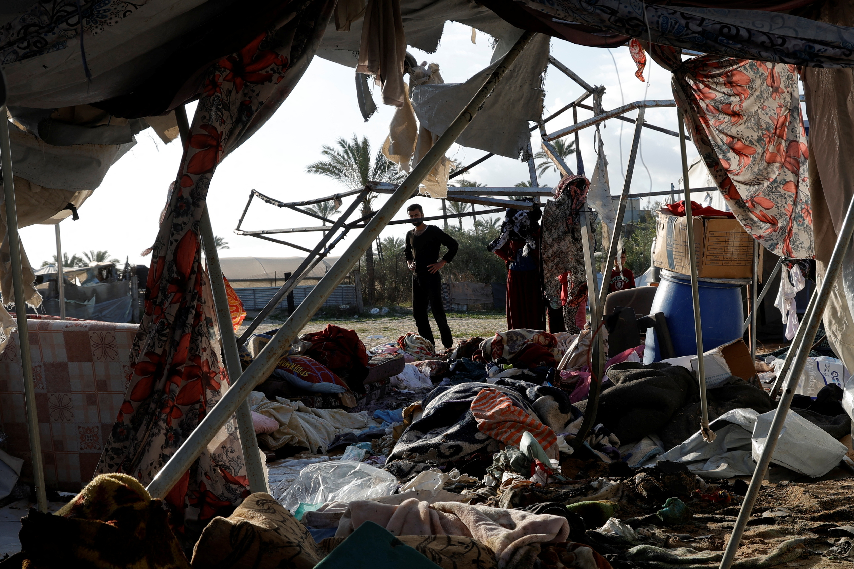 Palestinians inspect the damage at the site of an Israeli strike on a tent sheltering displaced people, in Khan Younis in the southern Gaza Strip, on April 15.Hatem Khaled/Reuters