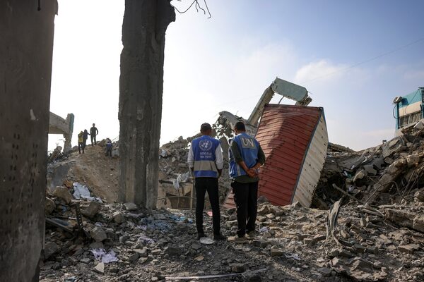 UN workers stand amid the rubble of an UNRWA school-turned-shelter, heavily damaged in an overnight Israeli strike in Jabalia in the northern Gaza Strip on May 10.BASHAR TALEB/AFP/Getty Images