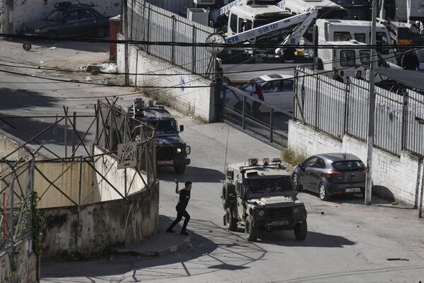 A Palestinian man throws stones at a convoy of Israeli military vehicles, during a raid in the West Bank city of Nablus on May 4.Majdi Mohammed/The Associated Press