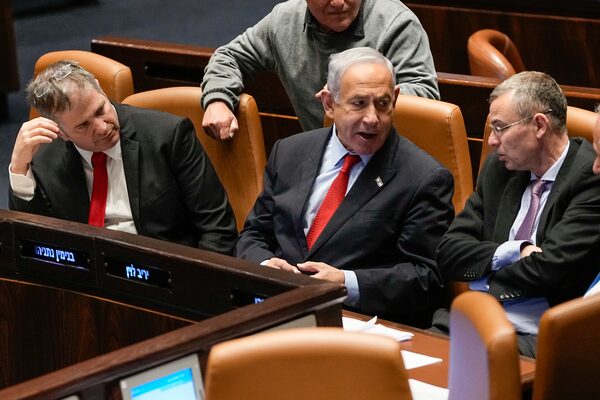 Israeli Prime Minister Benjamin Netanyahu, centre, speaks to Israeli Justice Minister Yariv Levin, right, as Education Minister Yoav Kisch, left, looks on in Israel's parliament, the Knesset, just before a vote on a contentious plan to overhaul the country's legal system, in Jerusalem, on Feb. 22.Ohad Zwigenberg/The Associated Press