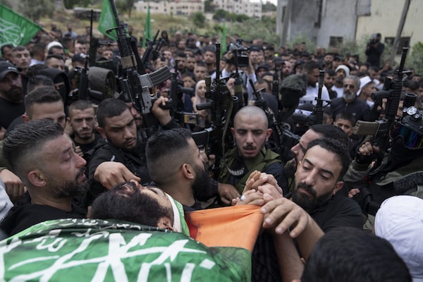 Mourners carry the body of Hamas local commander Mohammad Daraghmeh, 26, wrapped with a Hamas flag, during his funeral in the West Bank city of Tubas, on April 12.Nasser Nasser/The Associated Press