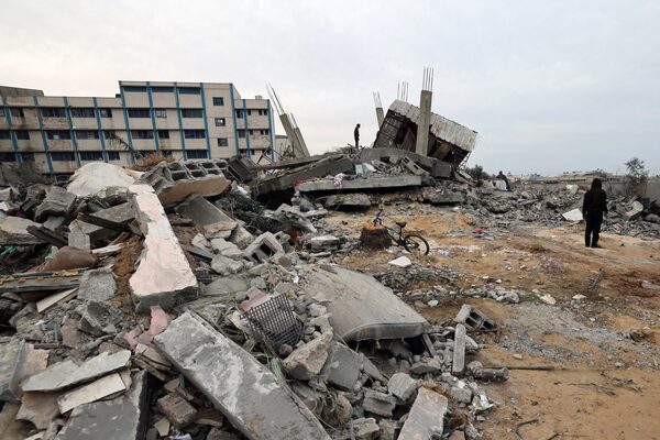 Palestinians check debris near a UN school where displaced take shelter after an Israeli strike hit a house nearby, in Rafah in the southern Gaza Strip on Dec. 21.MOHAMMED ABED/Getty Images