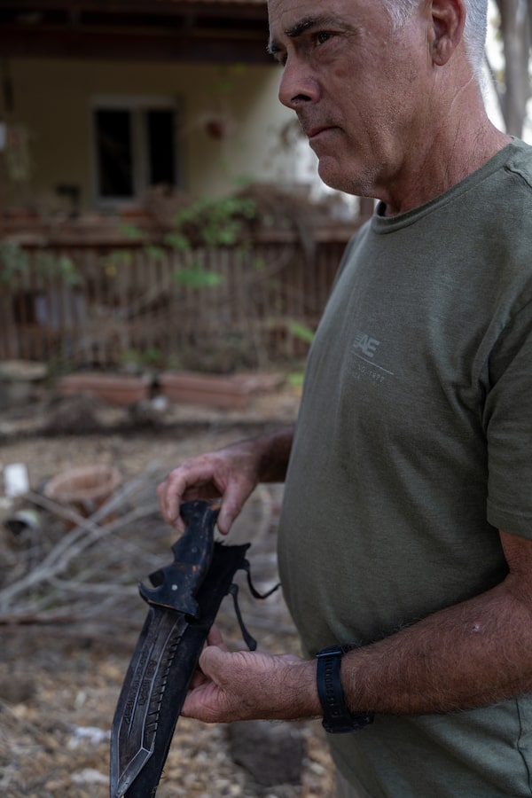 Simon King inspects a knife he found in Be'eri with an Arabic inscription: ‘The Martyr Izz ad-Din al-Qassam Brigades – The Nukhba forces,’ referring to a unit of Hamas's military wing.David Blumenfeld/The Globe and Mail
