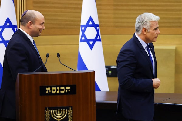 Israeli Prime Minister Naftali Bennett and Foreign Minister Yair Lapid leave after a news conference in Jerusalem, on June 20.RONEN ZVULUN/Reuters
