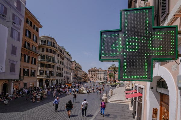 A Pharmacy shop sign displays the outside temperature of 46 Celsius degrees (114.8 F) in downtown Rome, on July 18.Domenico Stinellis/The Associated Press