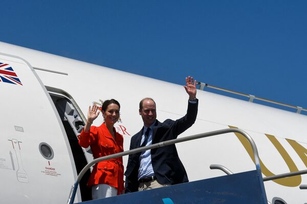 Britain's Prince William, Duke of Cambridge, and Catherine, Duchess of Cambridge, wave as they board their plane after their trip to Belize, at Belize City's Philip S.W.Goldson International Airport on March 22, during their Caribbean tour.JOHAN ORDONEZ/AFP/Getty Images
