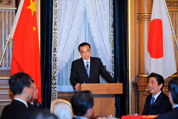 Premier of the State Council Li Keqiang from China delivers a speech during the opening of a dinner hosted by Japanese Prime Minister Shinzo Abe, right, at the state guest house in Tokyo, Japan, on May 9, 2018.David Mareuil/The Associated Press