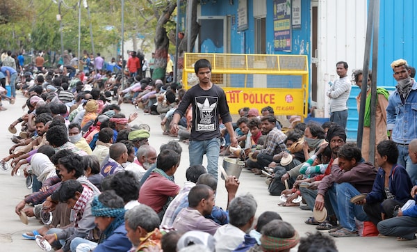 Homeless and impoverished people receive food at a government shelter in New Delhi, India, on March 26, 2020.The Associated Press