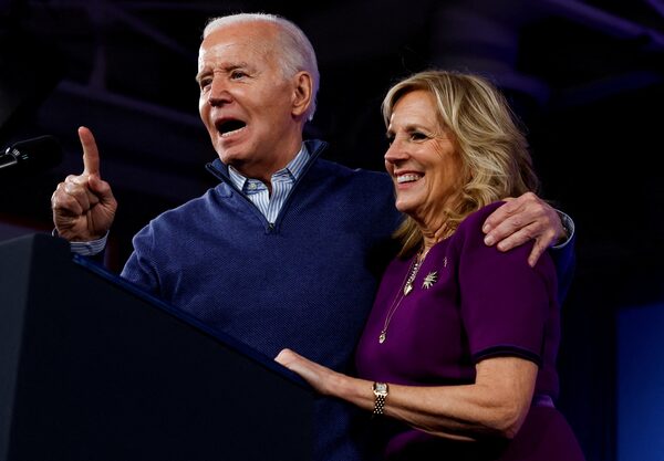U.S. President Joe Biden and first lady Jill Biden during a campaign event at Strath Haven Middle School in Wallingford, Penn., on March 8, 2024.Evelyn Hockstein/Reuters