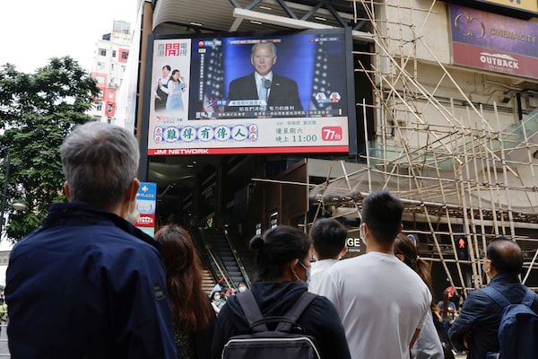 A news report on Joe Biden appears on a television screen in Hong Kong on Nov. 8, 2020.TYRONE SIU/Reuters