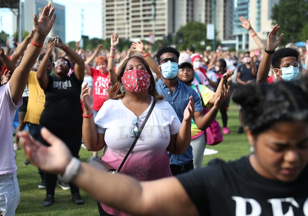 People pray together during a Juneteenth event organized by the One Race Movement, at Centennial Olympic Park, in Atlanta, Ga., on June 19, 2020.Joe Raedle/Getty Images