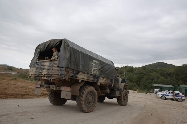 This photograph taken on Sept. 23, 2023, onboard a government bus, shows a military truck (L) passing a police checkpoint (R) near the town of Chanagchi in Azerbaijans' controlled region of Nagorno-Karabakh. Nagorno-Karabakh separatists were expected to lay down their arms on Sept. 23, 2023, under an agreement reached with the Azerbaijan government following its lightning offensive.EMMANUEL DUNAND/AFP/Getty Images
