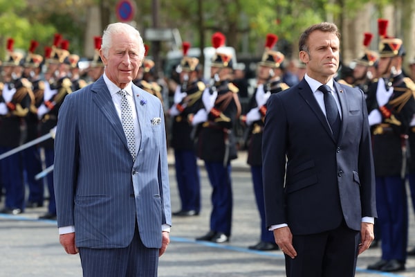 King Charles and French President Emmanuel Macron stand to attention during an official welcoming ceremony at the Arc de Triomphe in Paris on Sept. 20, on the first day of a state visit to France.CHRIS JACKSON/AFP/Getty Images