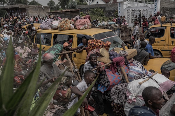 People gather at a busy road while carrying some of their belongings as they flee the Masisi territory following clashes between M23 rebels and government forces, at a road near Sake, Democratic Republic of the Congo, on Feb. 7.AUBIN MUKONI/Getty Images