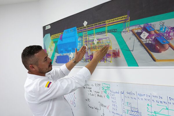 Electromechanical engineer Carlos Ruiz shows an illustration of the hydrogen plant of Hevolucion, a company which will start producing one tonne of clean hydrogen daily in November, in Sabaneta, on the outskirts of Medellin, Colombia, on Oct. 3.Juan David Duque/Reuters