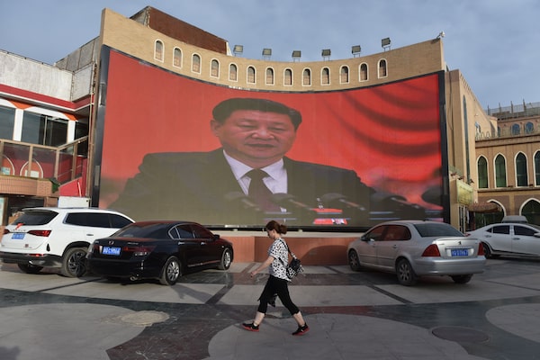 Chinese President Xi Jinping appears on a screen on the streets of Kashgar, in Xinjiang region, in 2019. Xinjiang, where internet controls are especially intense, is one of at least three regions where Geedge works with government agencies.GREG BAKER/Getty Images