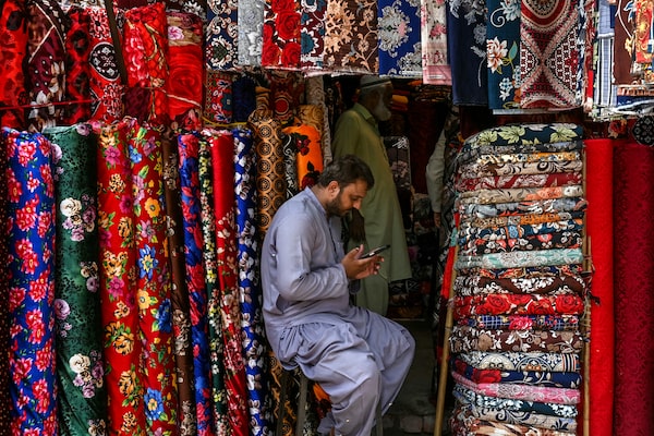 A vendor uses a mobile phone as he waits for customers at a market in Lahore, Pakistan, in July. Companies, including many Western tech firms, have enabled authoritarian regimes to filter and block online traffic for decades.ARIF ALI/AFP/Getty Images