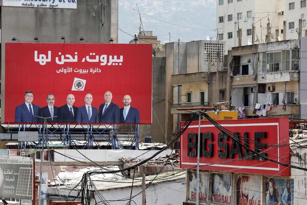 An electoral billboard is erected atop a building in Lebanon's capital Beirut, on May 14, 2022, on the eve of parliamentary elections.LOUAI BESHARA/AFP/Getty Images