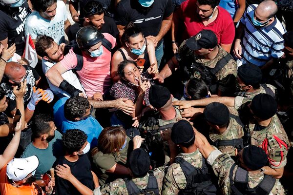A woman yells at Lebanese soldiers who are blocking a road as French President Emmanuel Macron visits the Gemmayzeh neighborhood, which suffered extensive damage from the explosion.The Associated Press