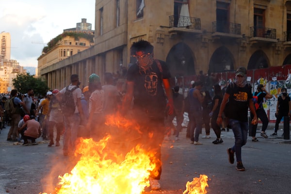 A fire burns on the street during an anti-government protest at parliament on Aug. 10, 2020 in Beirut, Lebanon.Getty Images/Getty Images