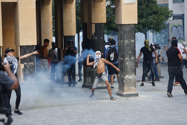 A man throws a tear gas canister back at the security forces who fired it into the crowd during an anti-government protest at parliament on Aug. 10, 2020 in Beirut, Lebanon.Getty Images/Getty Images