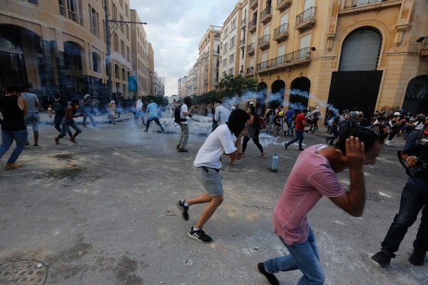 Protesters run away from teargas fired by security forces during an anti-government protest at parliament on Aug. 10, 2020 in Beirut, Lebanon.Getty Images/Getty Images