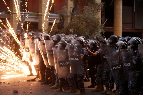 Security forces deal with fireworks during an anti-government protest at parliament on Aug. 10, 2020 in Beirut, Lebanon.Getty Images/Getty Images