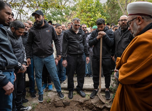 An imam leads funeral prayers for Abdulhadi Khaskia, 28, who was killed in the Israeli airstrike on the Sidon apartment block.Siegfried Modola/The Globe and Mail