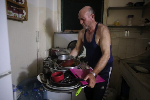 Mr. Homsi, who has lived in Lebanon for 35 years, shares a small apartment with his two grown sons. Mattresses sit on each side of the room and there are ashtrays scattered between them. In addition to being without electricity, they don’t have water either. He said the situation is like “waiting for death. Living, but waiting for death.”
