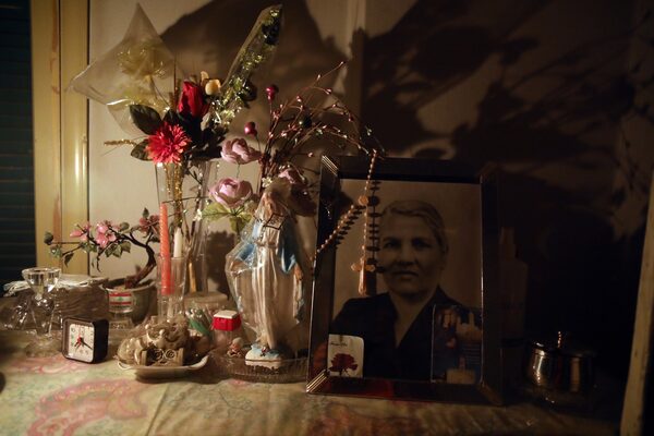 In the dark, she slowly gets up from her chair and carries the candle through a door into her bedroom. On a cabinet beside the window is a photo of her mother. “My mom was pretty,” she said. Above the window, there’s a photo of her nephew. “He died in the civil war,” she said. “Every era, there’s a new crisis.”
