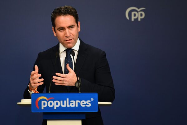 The conservative People's Party (PP) general secretary Teodoro Garcia Egea speaks after voting ended in Spain on Sunday.GABRIEL BOUYS/AFP/Getty Images