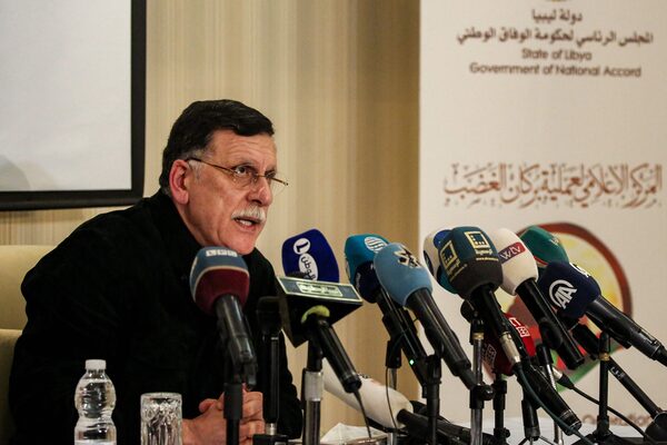 Fayez Sarraj, Prime Minister of Libya's UN-recognized Government of National Accord, speaks during a news conference in Tripoli, on Feb. 15, 2020.MAHMUD TURKIA/AFP/Getty Images