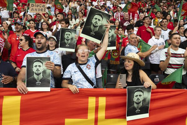 Fans hold pictures of Diogo Jota at a soccer match between Spain and Portugal in Bern, Switzerland on Thursday.Peter Klaunzer/The Associated Press