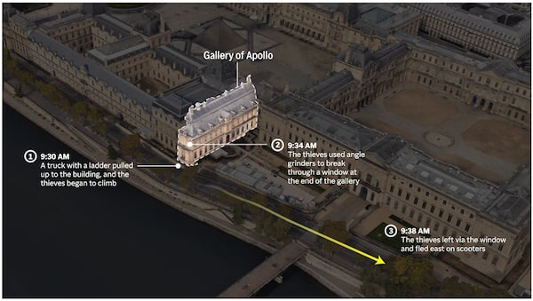 Authorities say the thieves spent less than four minutes inside the Louvre on Sunday morning: a freight lift was wheeled to the Seine-facing façade, a window was forced open and two vitrines were smashed.