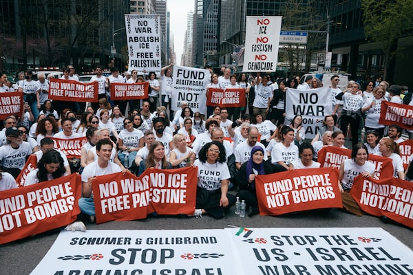 Protesters with Jewish Voice for Peace block traffic during a demonstration outside the New York office of U.S. Sen. Chuck Schumer, calling for an end to the U.S.-Israel war with Iran and opposing U.S. weapons support on April 13 in New York.Andres Kudacki/The Associated Press