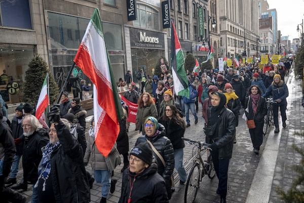 Demonstrators march to protest against the U.S. and Israel for initiating the Middle East war in Montreal, Que., on March 21.ANDREJ IVANOV/AFP/Getty Images
