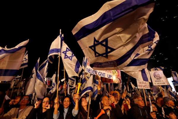 People hold Israeli flags as they attend a protest against Israel's Prime Minister Benjamin Netanyahu's new right-wing coalition and its proposed judicial changes to reduce powers of the Supreme Court in Tel Aviv, Israel February 25, 2023.AMMAR AWAD/Reuters