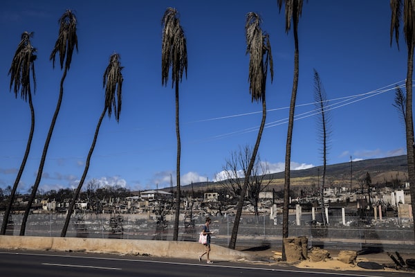 A pedestrian walks along Honoapiilani Highway near properties destroyed by the West Maui Fire in Lahaina on the island of Maui, Hawaii on Aug. 17.Stephen Lam/The Associated Press