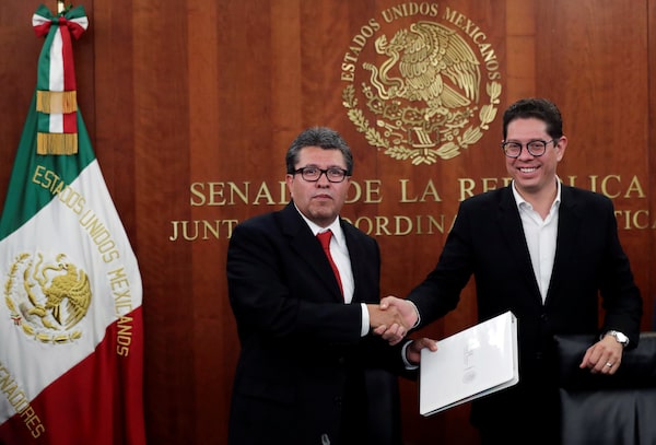 Mexican senator Ricardo Moreal, left, shakes hands with Juan Carlos Baker, Mexico's Undersecretary of Foreign Trade after he announced a trilateral pact on NAFTA during a news conference at the Senate building in Mexico City, Mexico, Sept. 30, 2018.HENRY ROMERO/Reuters