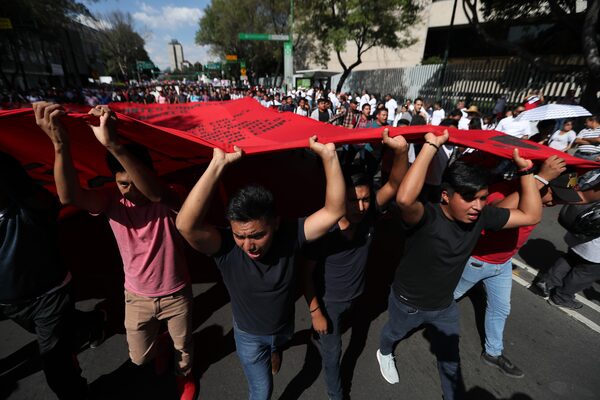 Demonstrators march in remembrance of the 1968 Tlatelolco student massacre, an event considered part of the Mexico's 'dirty war' when the government used its forces to suppress political opposition in Mexico City, Oct. 2, 2019.Fernando Llano/The Associated Press