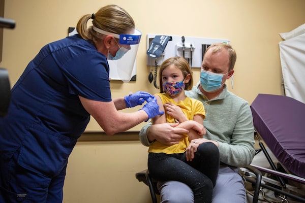 Sutton Gilliam, 7, a first grader at Potter Gray Elementary, sits on her father Timothy's lap as she receives her COVID-19 vaccine in Bowling Green, Ky., on Nov. 17, 2021.Grace Ramey/The Associated Press