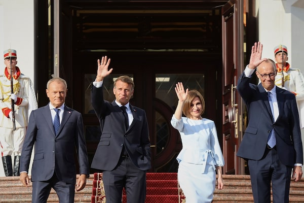 From left, Polish Prime Minister Donald Tusk, French President Emmanuel Macron, Moldova's President Maia Sandu and German Chancellor Friedrich Merz in Chisinau on Wednesday. Brussels agreed to open accession negotiations with Moldova for EU membership last year.Aurel Obreja/The Associated Press