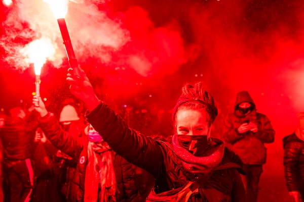 Demonstrators light flares during a pro-choice demonstration in front of the constitutional court in Warsaw, Poland, on Jan. 28, 2021.WOJTEK RADWANSKI/AFP/Getty Images