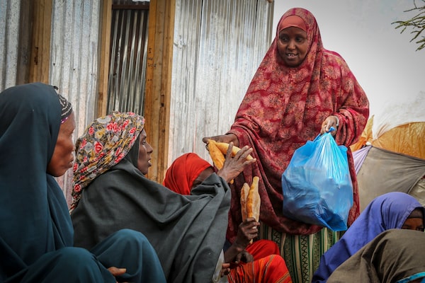 Somalis who fled drought-stricken areas receive food donations from city residents after arriving at a makeshift camp on the outskirts of Mogadishu, on June 30.Farah Abdi Warsameh/The Associated Press