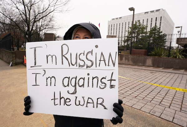 Anna, a Russian national, holds a sign in protest against Russia's invasion of Ukraine in front of the Russian Embassy in Washington on Feb. 25.KEVIN LAMARQUE/Reuters