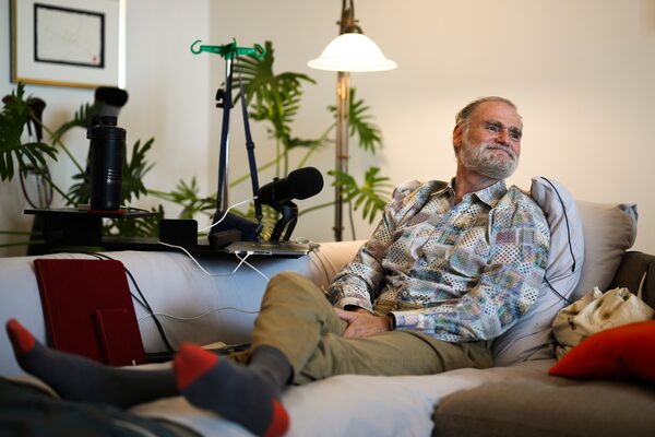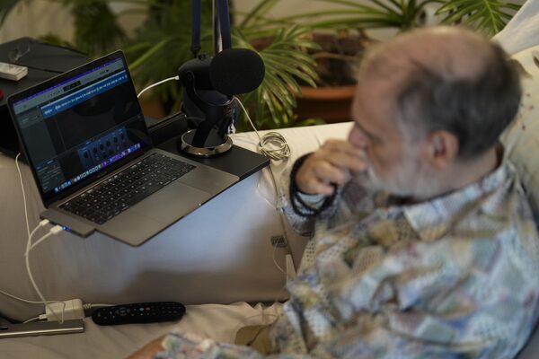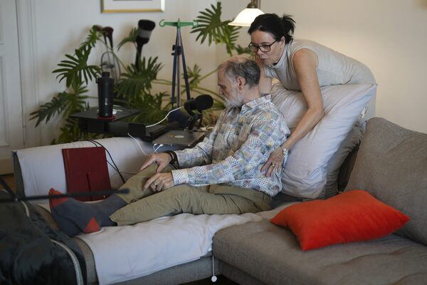Michael Bommer listens to his AI generated voice during a meeting with The Associated Press at his home in Berlin, on May 22.Markus Schreiber/The Associated Press
